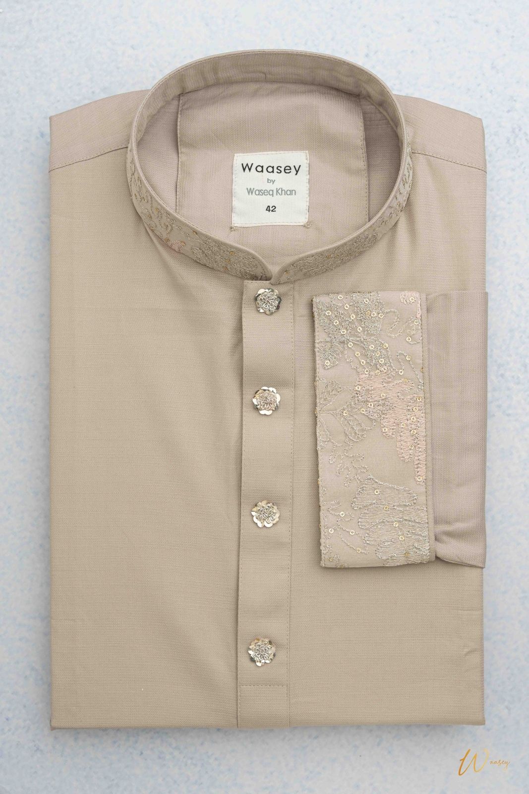 Olive Panjabi with Embroidered Collar & Sequin Cuff Detail