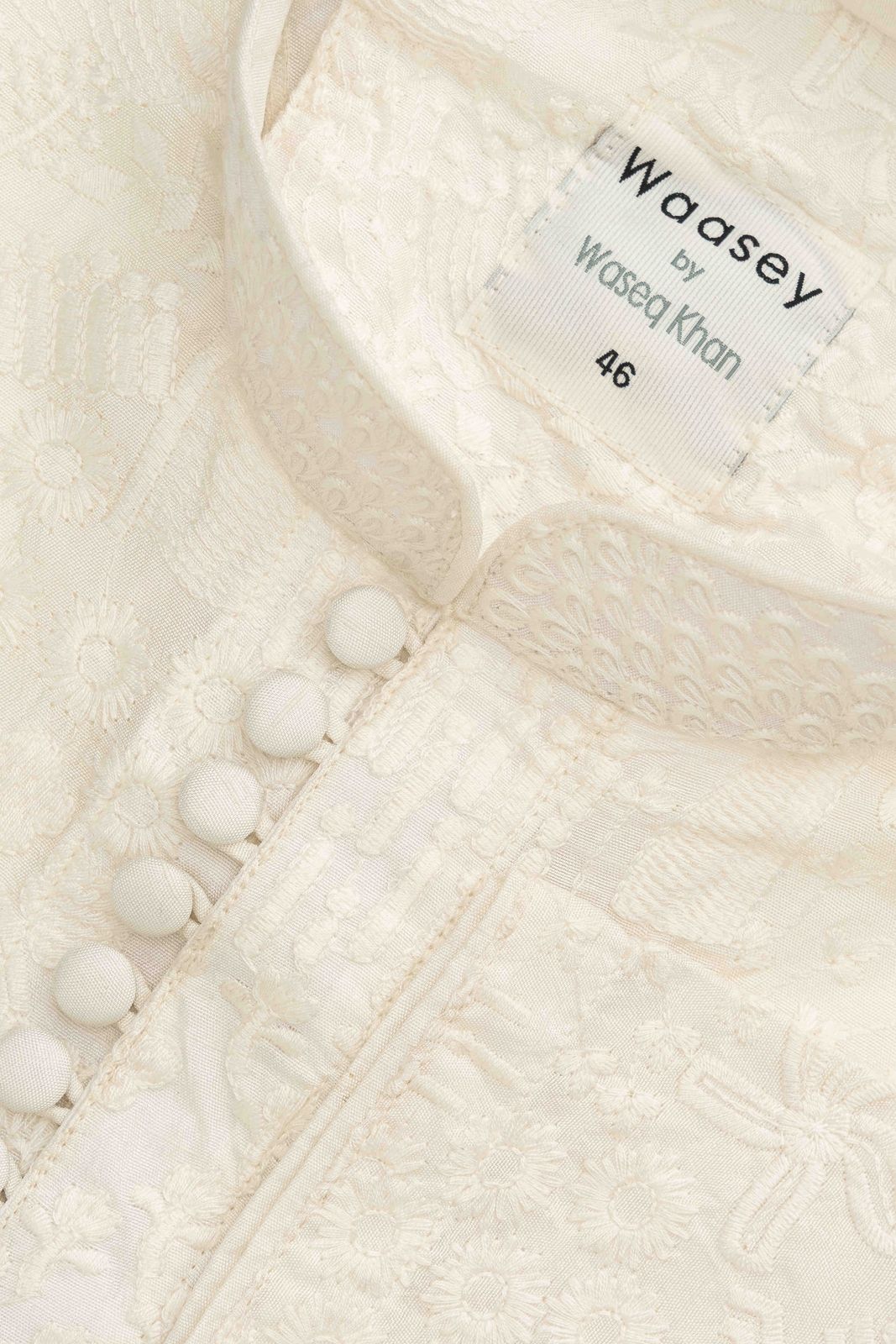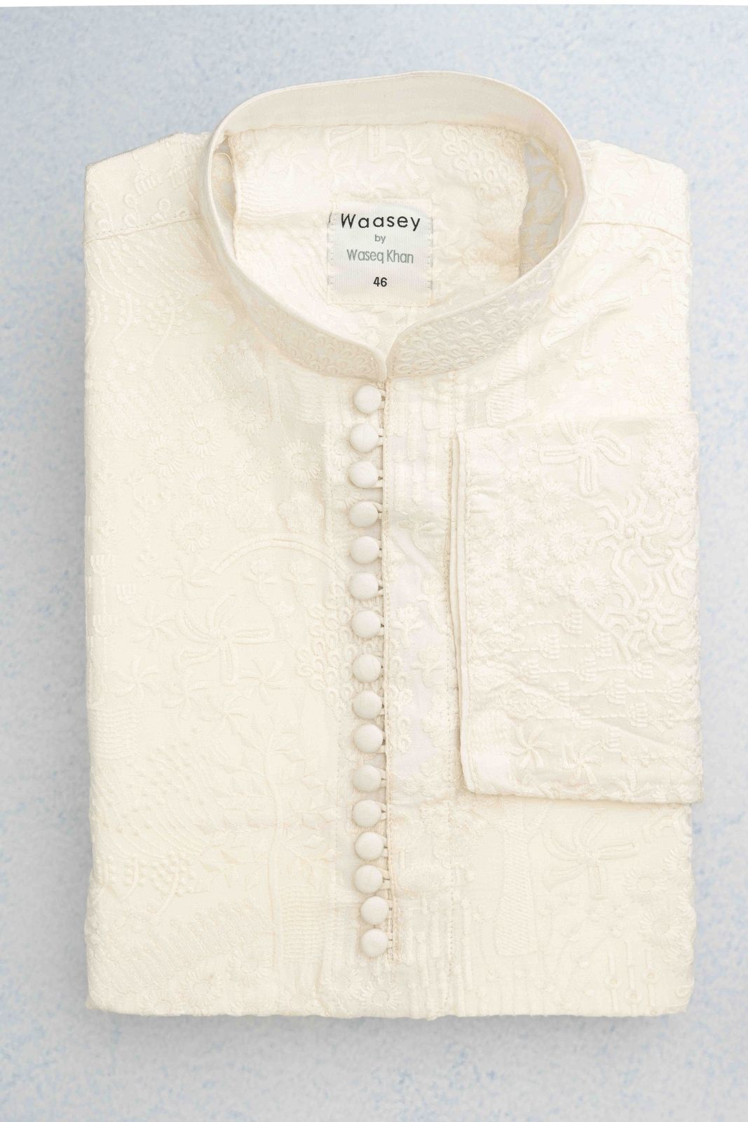 Crafted from luxurious ivory fabric, this Panjabi features intricate floral embroidery along the collar and placket, perfect for festive occasions. The standout detail of delicate floral motifs enhances its traditional elegance.