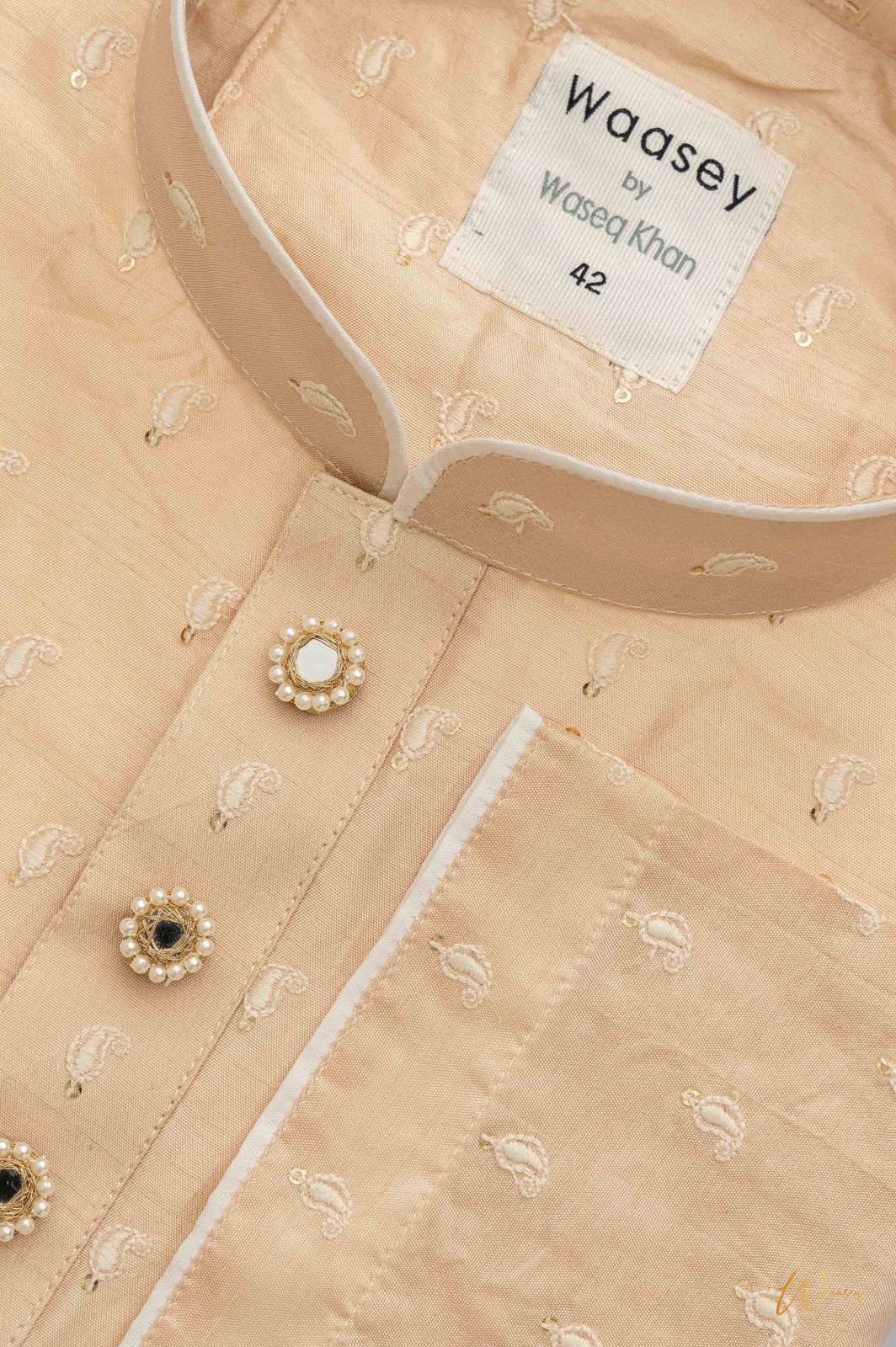 Crafted from lightweight peach fabric, this Panjabi features intricate embroidery and pearl-encrusted buttons, perfect for festive occasions. The standout detail is the embroidered button accents.