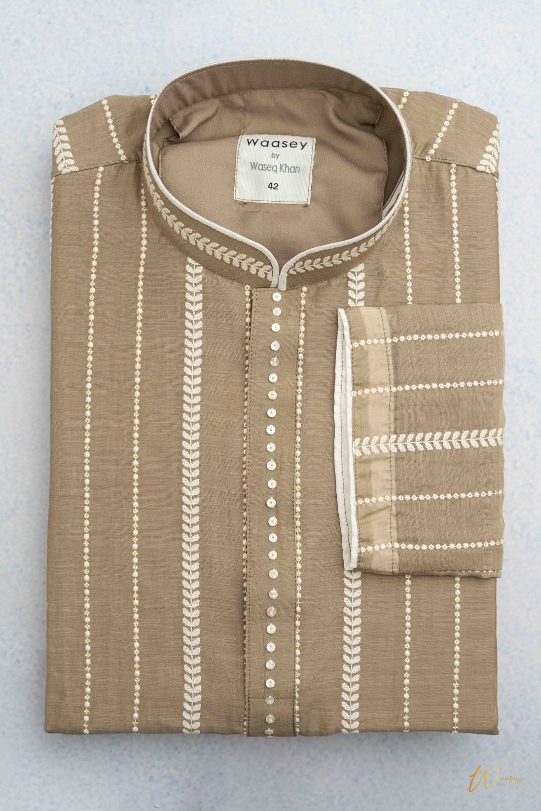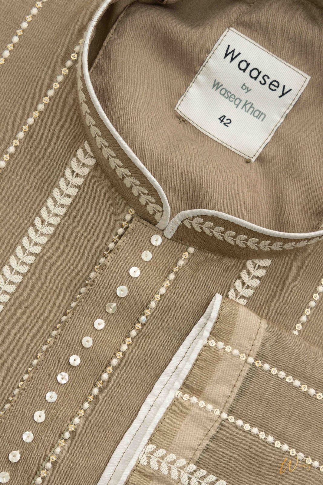 Crafted from lightweight cotton, this Panjabi features intricate white embroidery along the collar and cuffs, perfect for festive occasions. The subtle sheen of the fabric adds a touch of elegance to the traditional design.