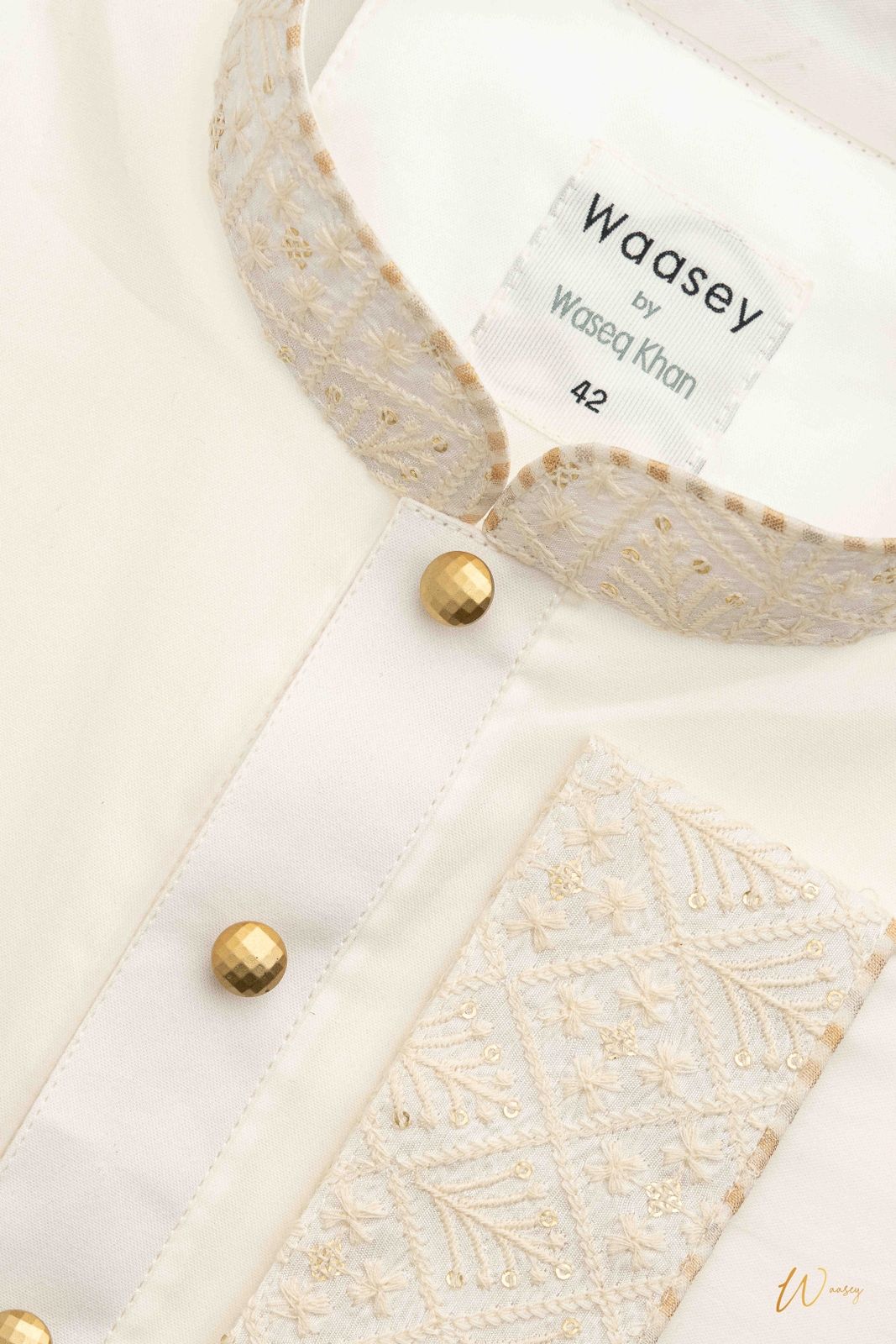 Crafted from lightweight cotton, this Panjabi features intricate gold embroidery along the collar and cuffs, perfect for festive occasions. The standout gold buttons add a touch of elegance to the traditional design. Distinctive detail: Ivory Embroidered Panjabi with Gold Buttons (QR-133).