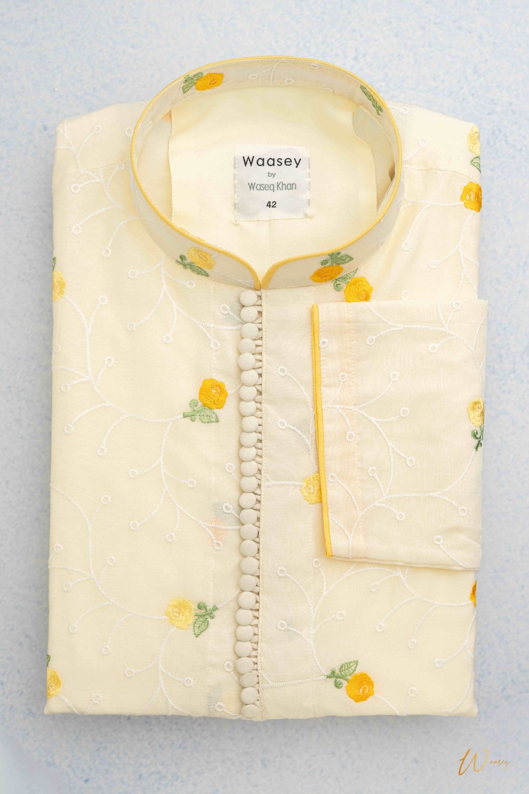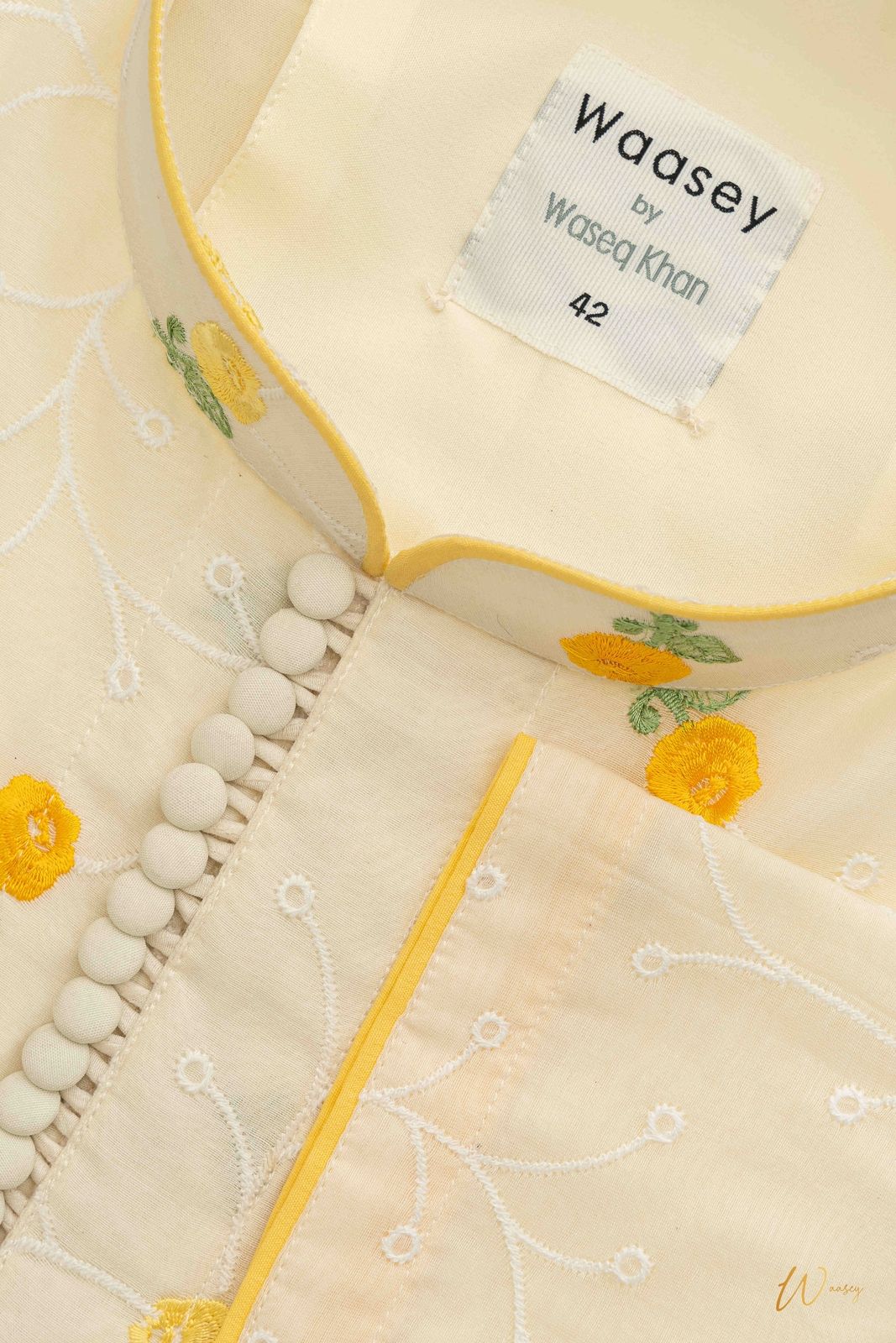 Crafted from lightweight cotton, this cream Panjabi features intricate white embroidery with yellow floral accents, perfect for festive occasions. The standout detail is the delicate embroidery that adds a touch of elegance.