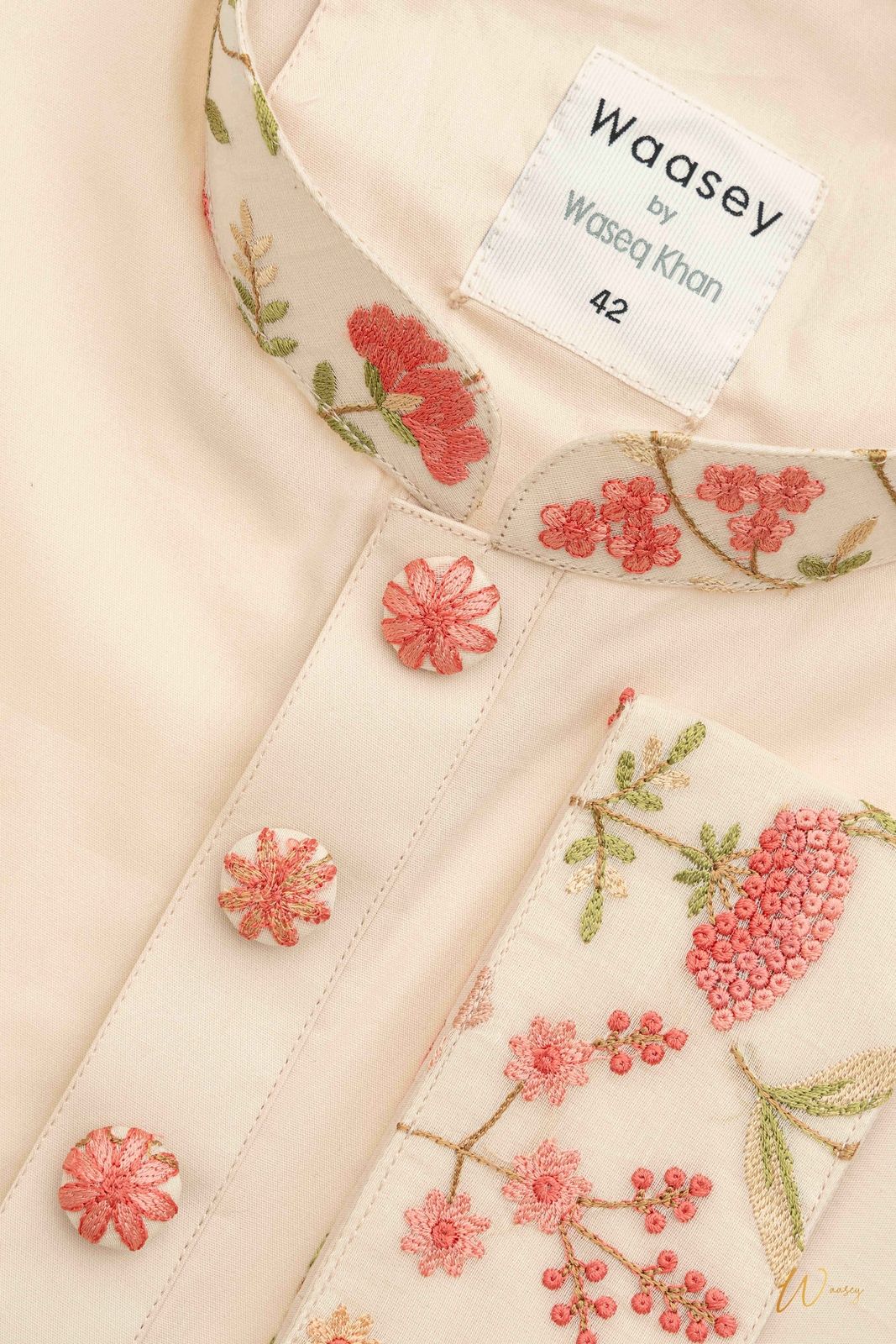 Crafted from lightweight cotton, this Panjabi features intricate floral embroidery along the collar and cuffs, perfect for festive occasions. The standout embroidered collar adds a touch of elegance to the traditional design. Distinctive detail: Cream Panjabi with Embroidered Floral Collar (QR-154).