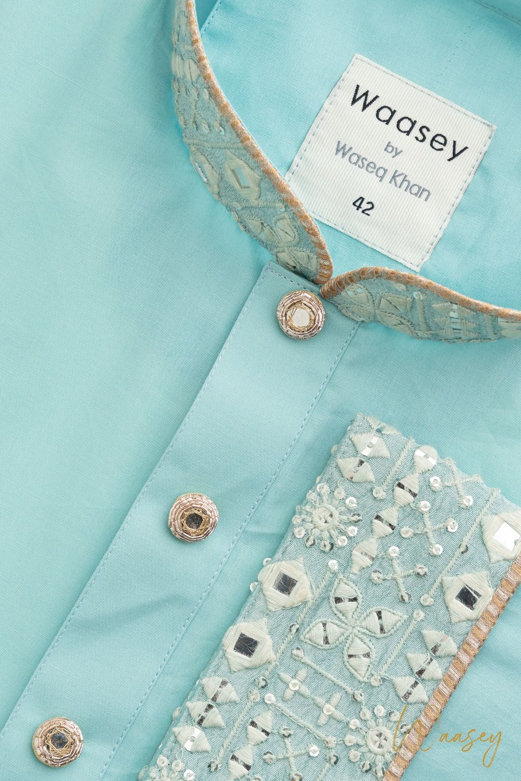 Crafted from lightweight cotton, this Panjabi features intricate mirror embroidery along the collar and cuffs, perfect for festive occasions. The subtle sheen of the embellishments adds a touch of elegance to the garment.