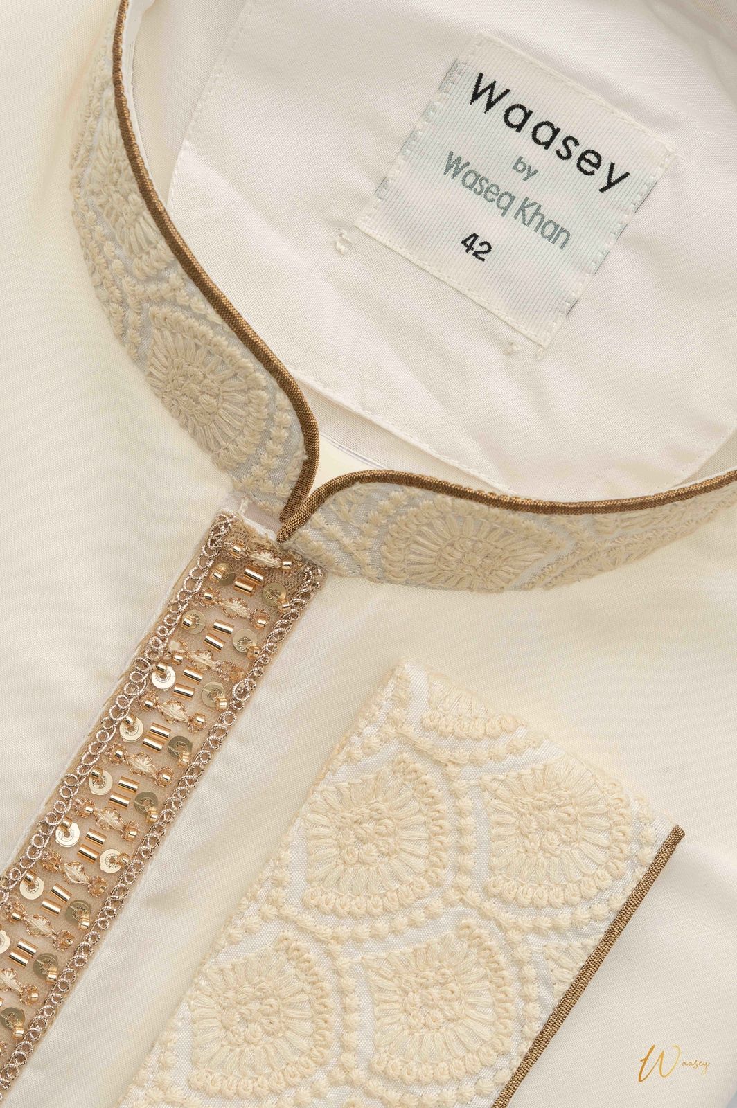 Crafted from smooth ivory fabric, this Panjabi features intricate gold embroidery along the placket, adding a touch of elegance suitable for festive occasions. The standout detail is the detailed embroidery that enhances the garment's traditional appeal.