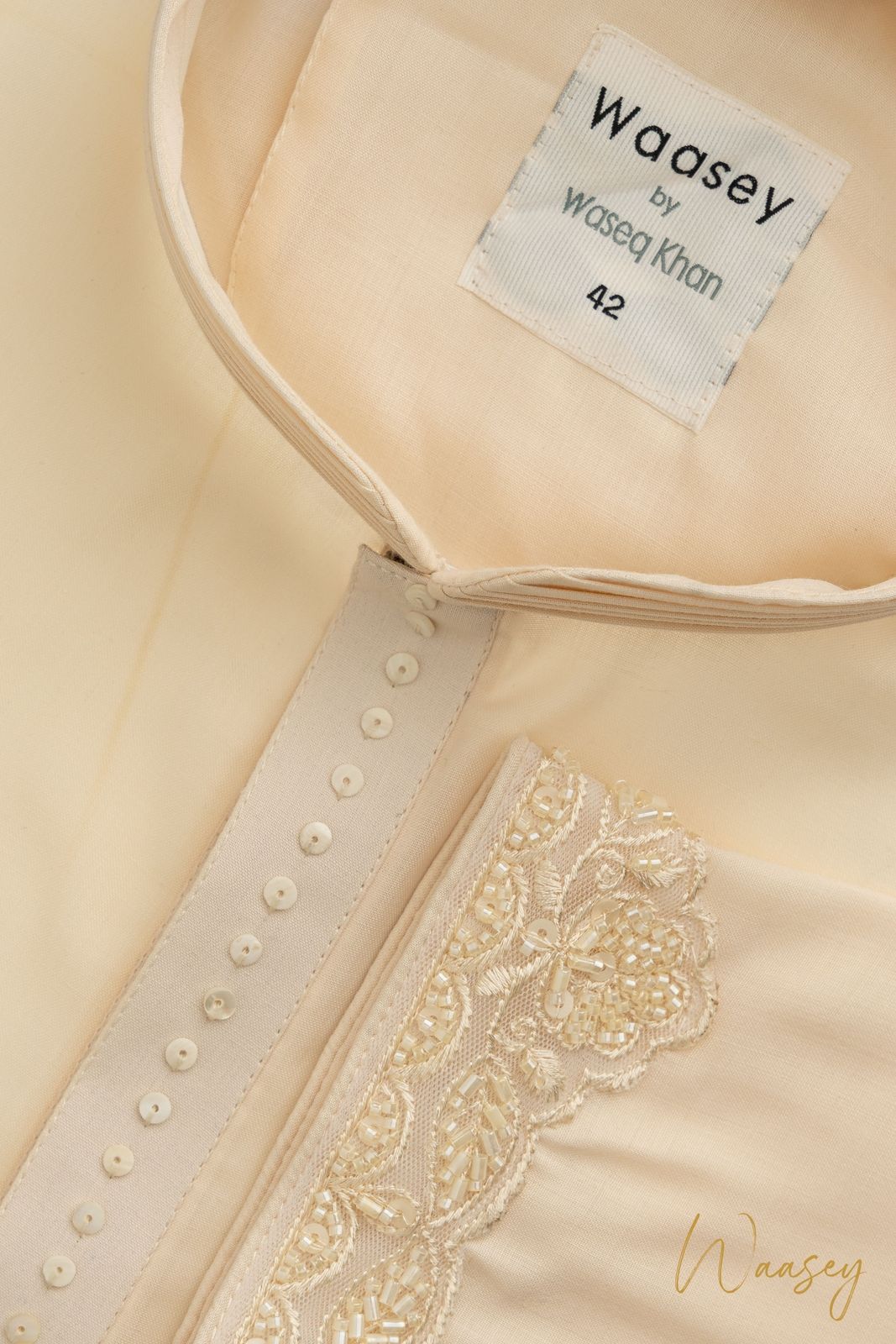 Crafted from lightweight cotton, this Panjabi features intricate gold embroidery along the cuffs, perfect for festive occasions. The standout detail is the delicate lace-like embroidery that adds a touch of elegance.