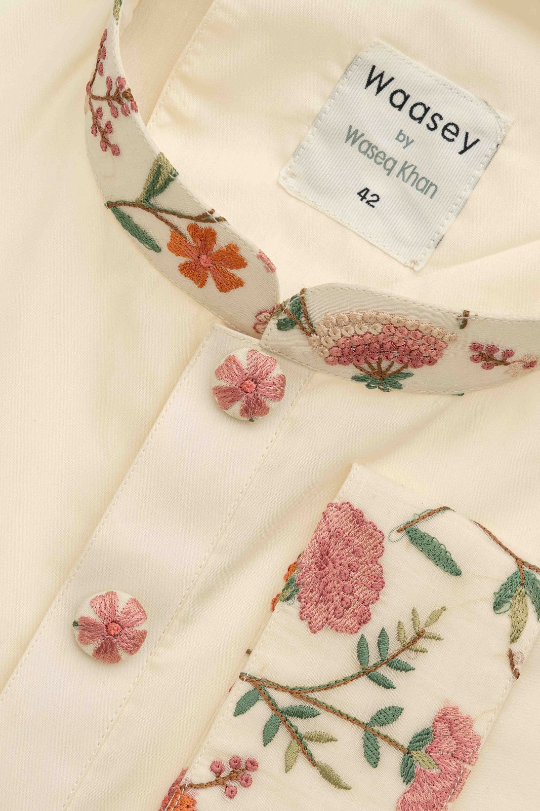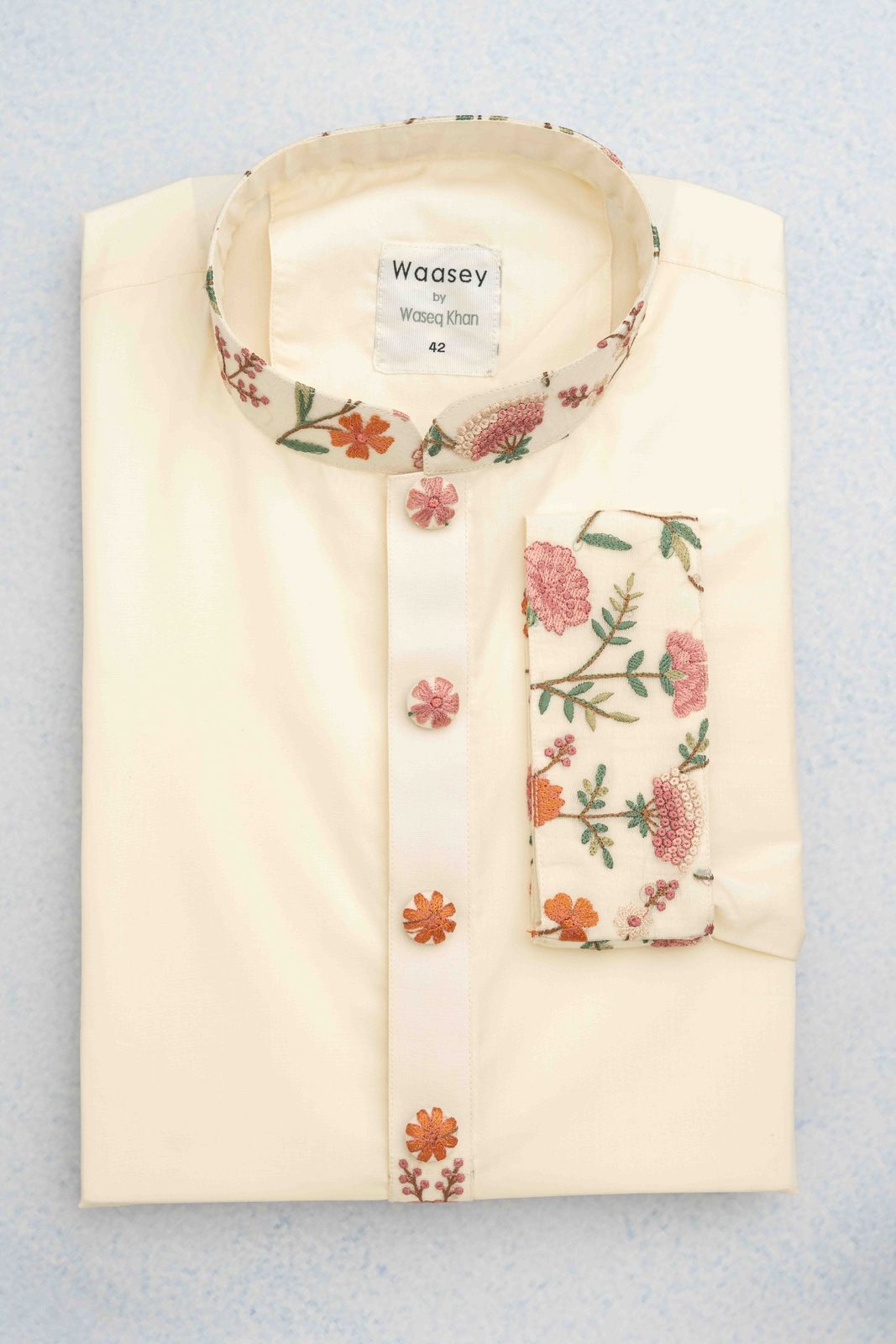 This Panjabi is crafted from lightweight cotton, adorned with intricate floral embroidery along the collar and cuffs, perfect for festive occasions. The standout detail is the delicate embroidery that adds a touch of elegance to the garment.