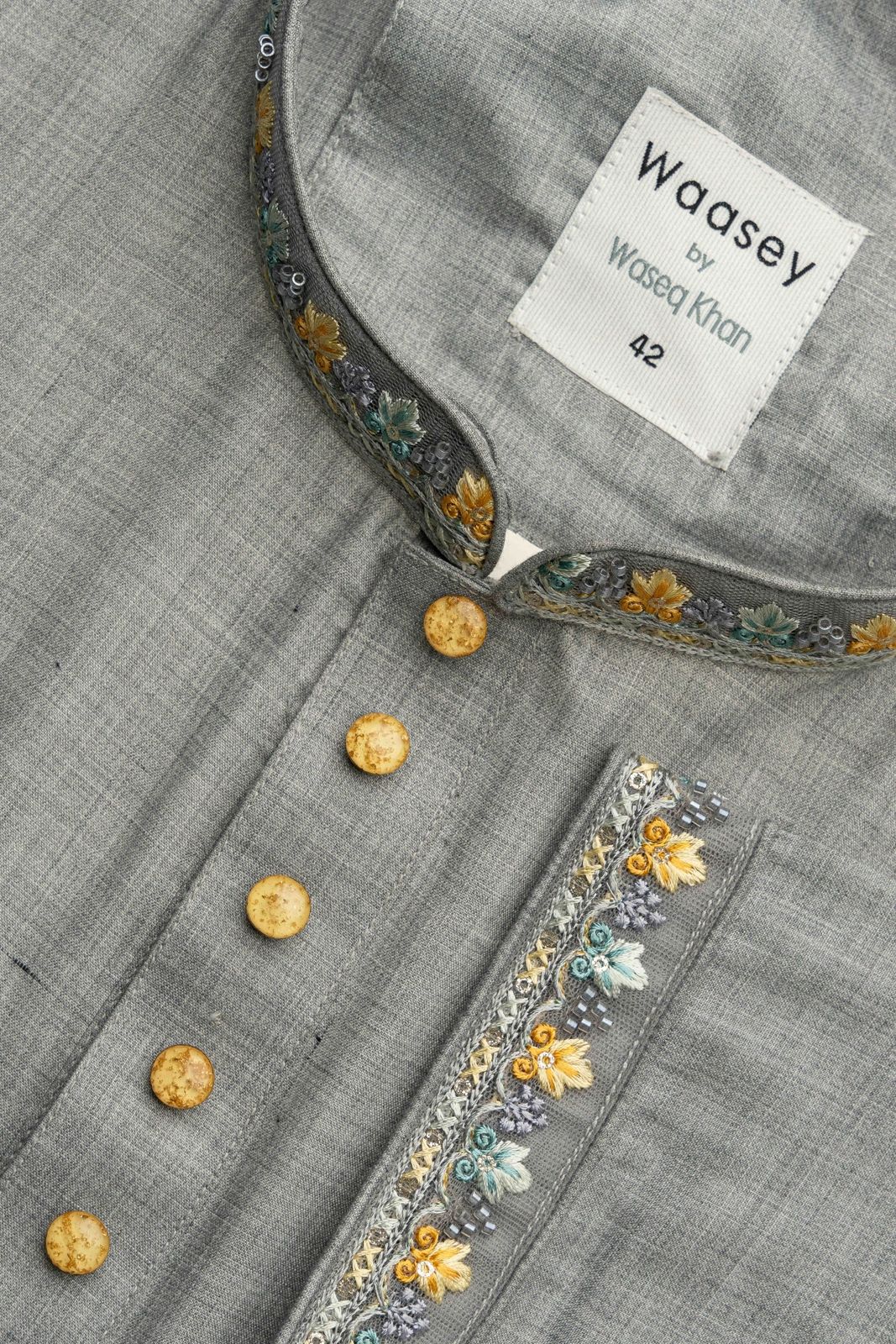 Crafted from breathable linen, this Panjabi features intricate floral embroidery along the collar and cuffs, perfect for festive occasions. The standout embroidery adds a touch of elegance to the classic design.