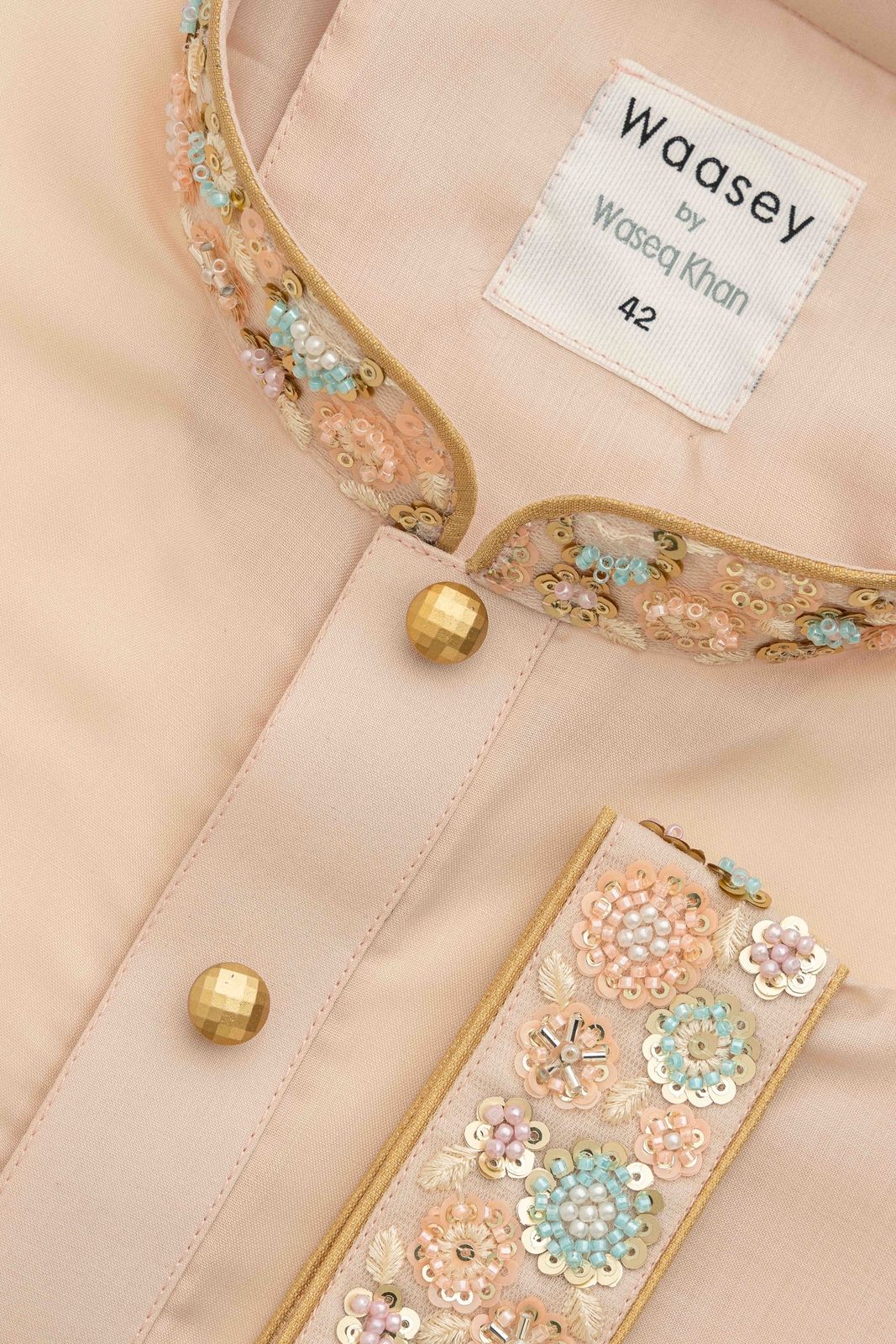This Panjabi features a luxurious peach fabric adorned with intricate gold floral embroidery along the collar and cuffs, perfect for festive occasions. The standout detail is the detailed embroidery that adds a touch of elegance to the garment.