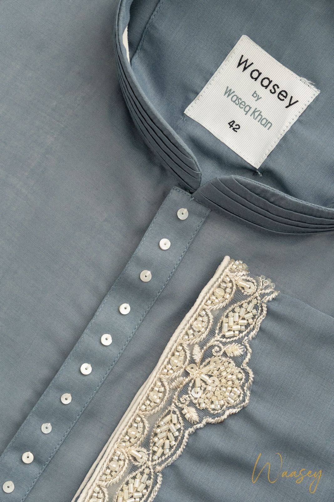 Crafted from lightweight cotton, this Panjabi features detailed embroidery along the collar and cuffs, perfect for festive occasions. The subtle sheen fabric adds a touch of elegance to the traditional design.