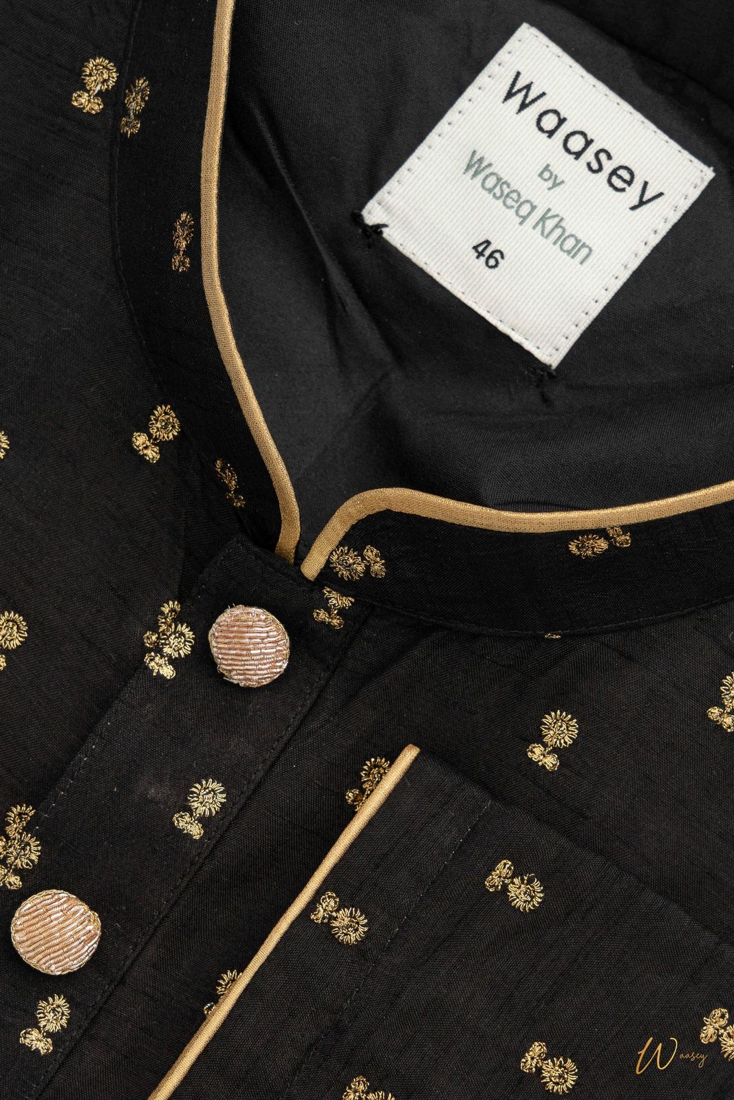 Make a bold, royal statement with this black panjabi from Waasey. The fabric features all-over golden motifs that create a rich festive look while keeping the design classy and balanced. The mandarin collar is finished with contrast golden piping, adding a sharp premium edge.