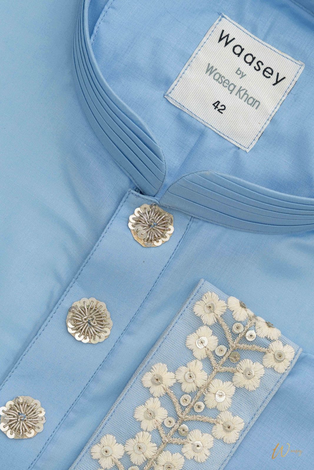 Crafted from lightweight cotton, this sky blue Panjabi features intricate white floral embroidery along the sleeve, perfect for festive occasions. The standout detail of the embroidered motif adds a touch of elegance to the traditional design.