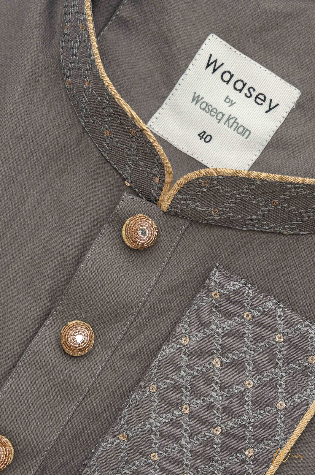 Crafted from smooth, lightweight fabric, this Panjabi features intricate gold embroidery along the collar and cuffs, perfect for festive occasions. The standout gold embroidered placket adds a touch of elegance to the garment.