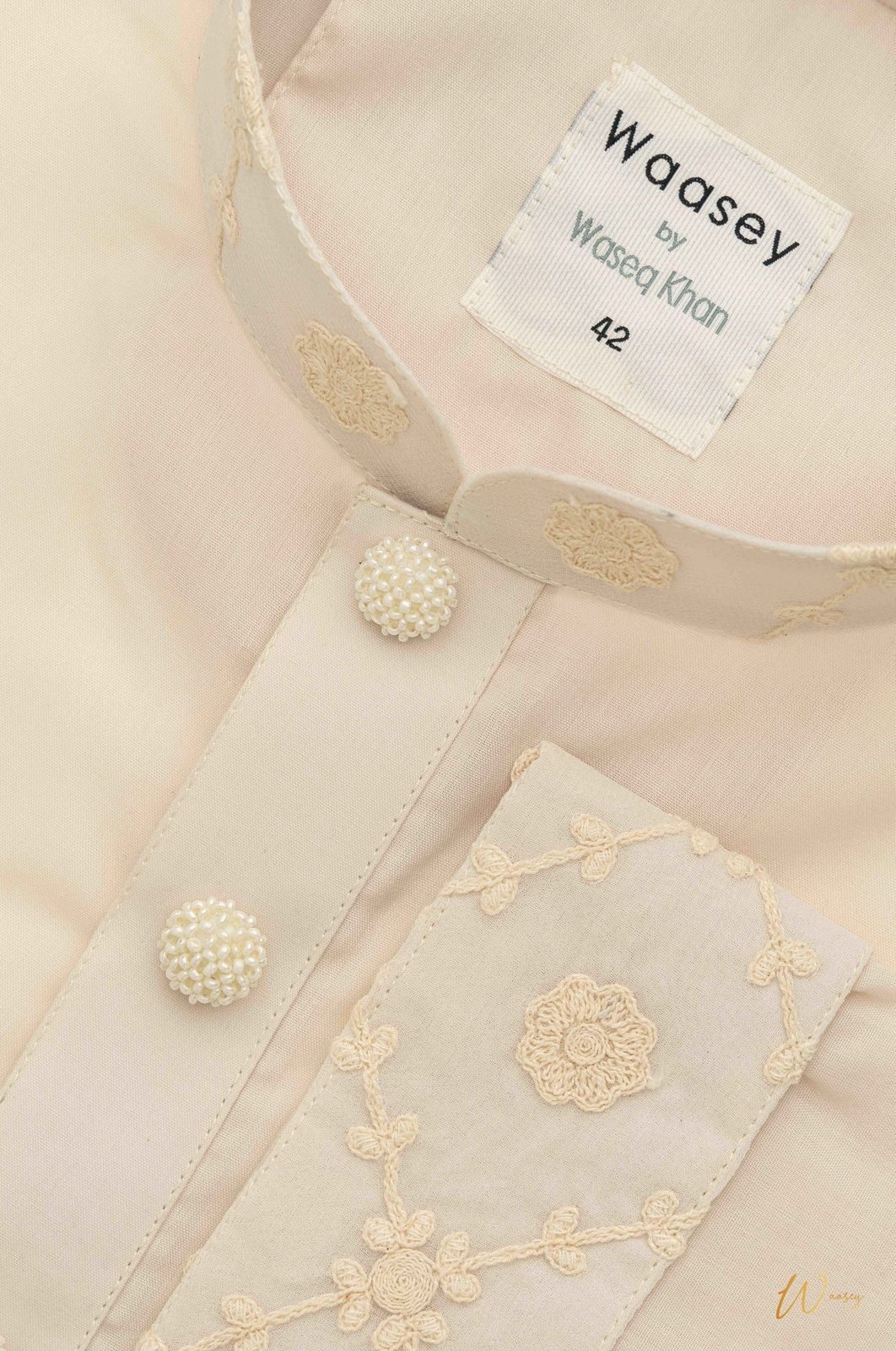 Crafted from smooth, breathable fabric, this Panjabi features intricate floral embroidery along the collar and cuffs, accented with pearl-like buttons for a touch of elegance. The standout embroidery detail makes it perfect for festive occasions.
