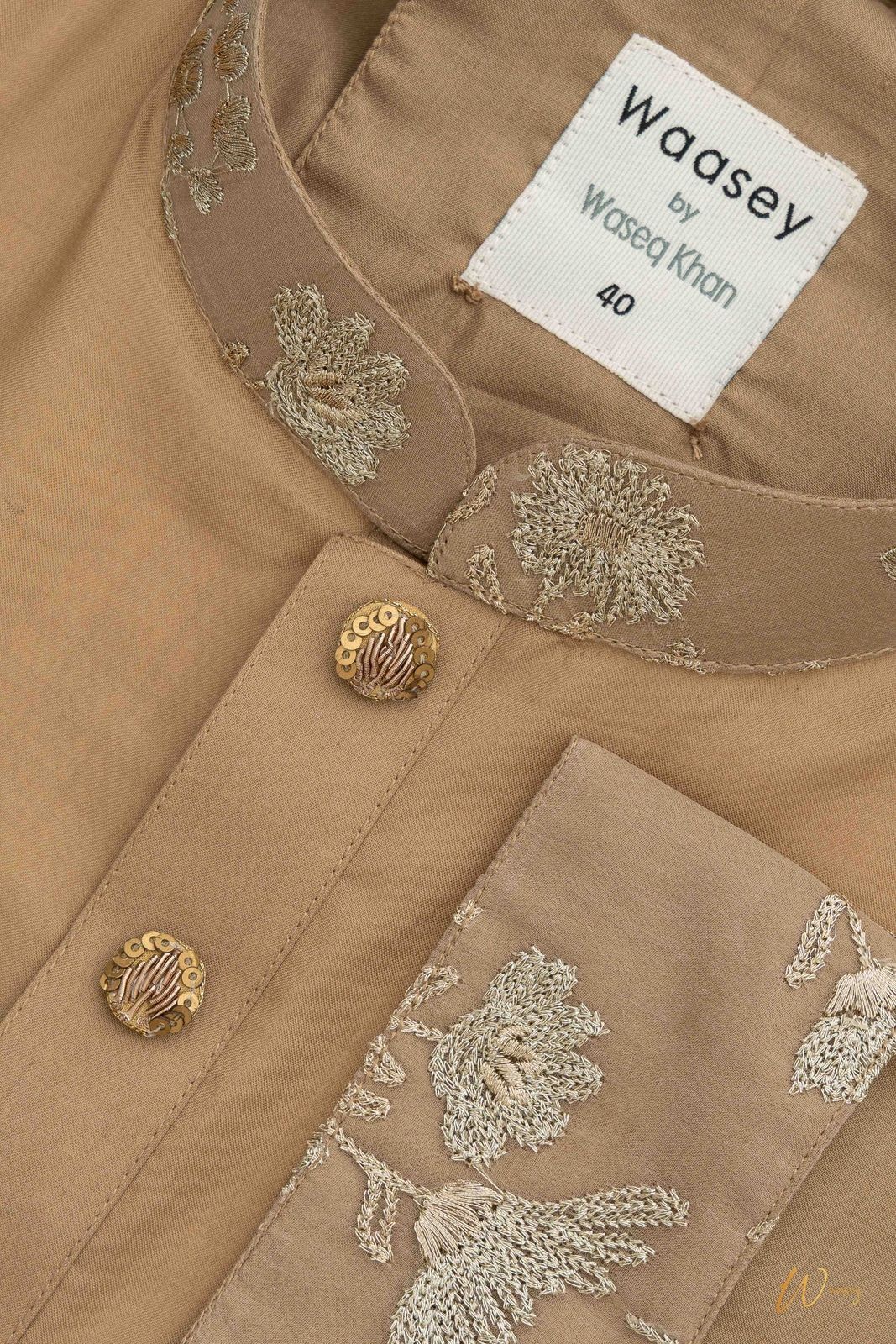 Step into a refined traditional look with this coffee brown panjabi from Waasey. The minimalist solid base is elevated with subtle floral embroidery on the mandarin collar, creating a premium, elegant finish without being too flashy.