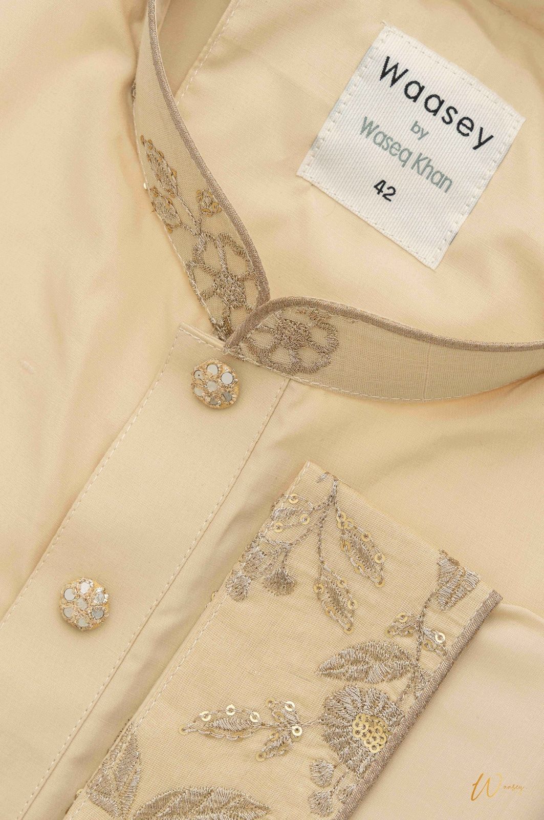 Crafted from lightweight fabric, this Panjabi features intricate embroidery on the collar and cuffs, perfect for festive occasions. The standout embroidered collar adds a touch of elegance to the traditional design.