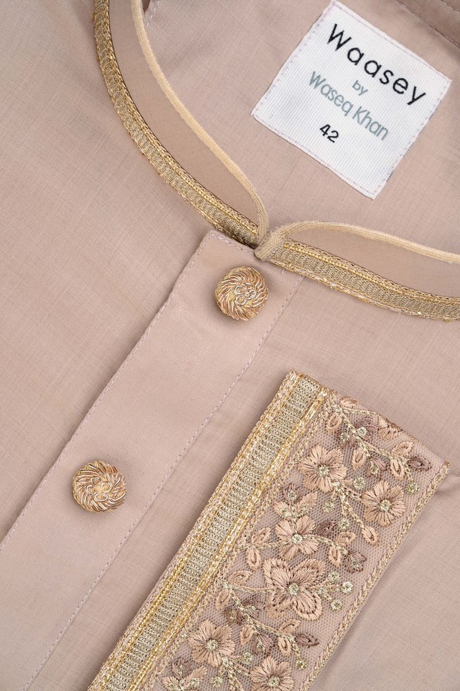 Sophisticated taupe panjabi with subtle gold trim along the mandarin collar. Features coordinating gold-toned buttons and an elegant embroidered pocket panel with matching neutral-toned floral patterns. The refined color and classic silhouette make this panjabi versatile for various formal occasions.