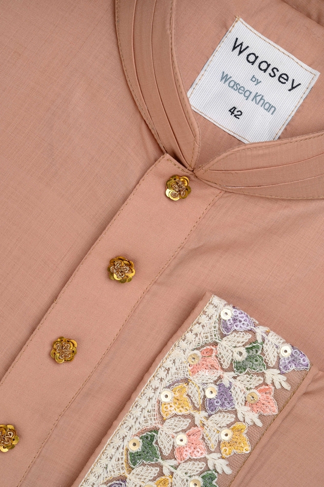 Warm peach-toned panjabi with striking gold decorative buttons and a mandarin collar. Features a distinctive patterned pocket panel with multi-colored geometric embroidery. The refined silhouette and luxurious details make this an excellent choice for festive gatherings.