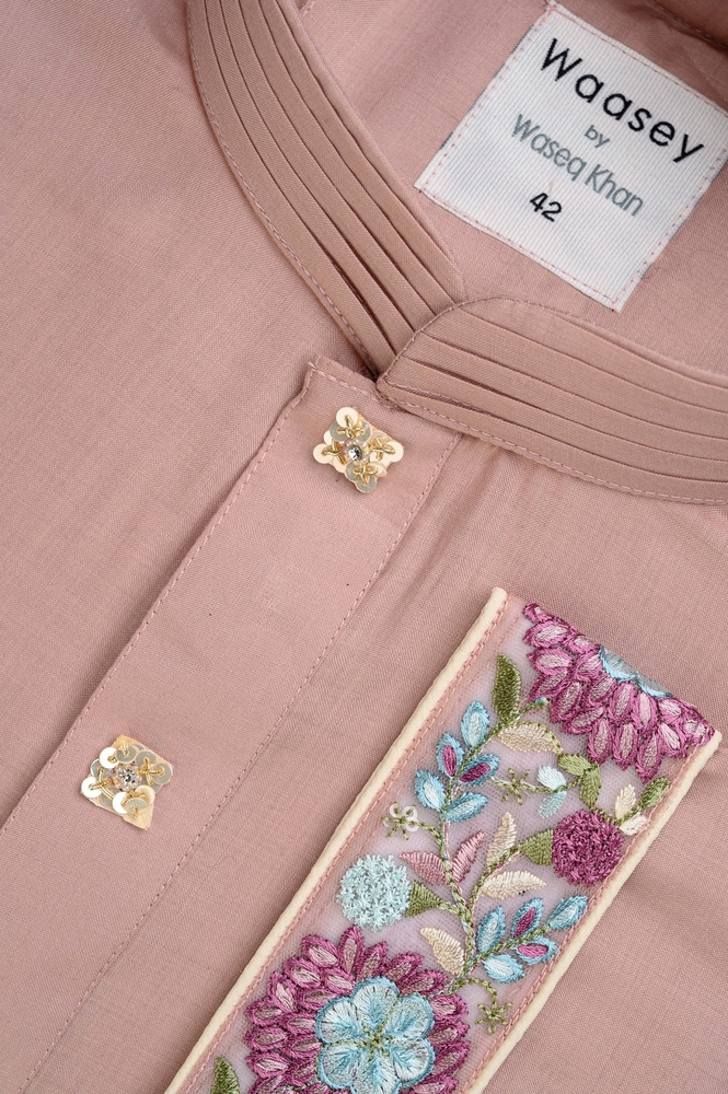 A sophisticated mauve Panjabi featuring gold floral buttons and an intricate embroidered panel with purple and turquoise floral motifs. The mandarin collar shows fine pleating work, and the overall design balances traditional craftsmanship with contemporary color. Ideal for wedding celebrations and formal gatherings.