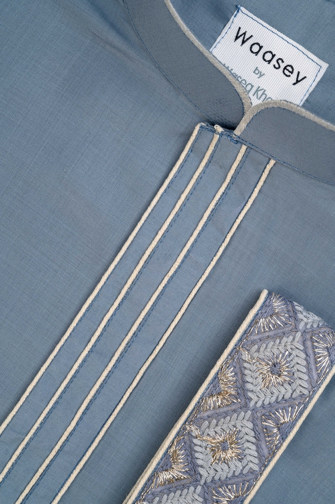 This sophisticated steel blue Panjabi from Waasey combines minimalist design with refined details. The structured mandarin collar features meticulous pintuck pleating that extends down the front. Decorative silver flower buttons provide subtle contrast against the cool blue tone, while the side pocket showcases geometric patterned embroidery in silver and white. This versatile piece offers understated elegance suitable for both professional settings and cultural celebrations.