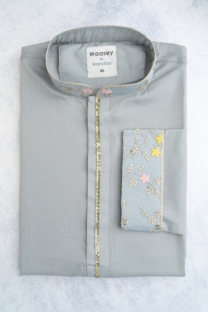 This gorgeous silver gray Punjabi is embellished with delicate floral embroidery. The closed neck design, golden zari work, and matching pockets make it ideal for wedding or festive events.