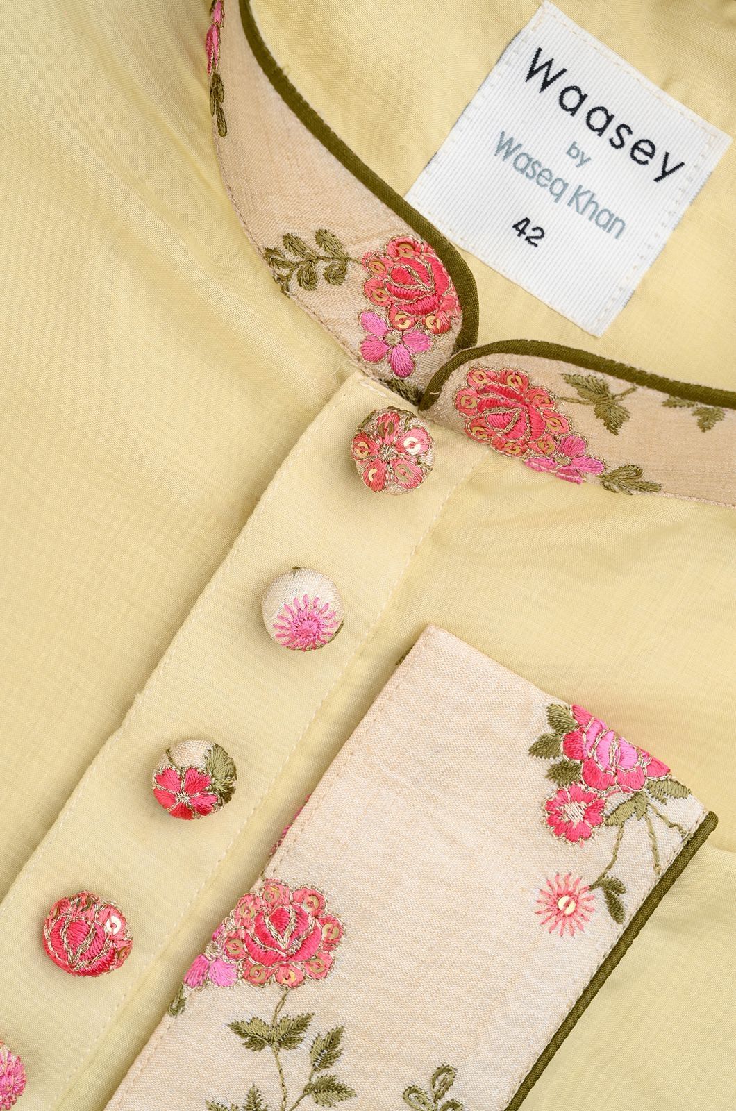 A pristine ivory panjabi featuring delicate pink rose embroidery on the collar, buttons, and pocket. The contrast between the cream base and the vibrant floral design creates a festive yet refined appearance. The fabric-covered buttons add a cohesive touch to this elegant traditional garment.
