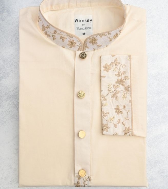 This panjabi is adorned with elegant golden vine embroidery on the collar, placket, and pocket, adding a touch of refined luxury. The delicate floral patterns complement the ivory fabric, creating a sophisticated and timeless look. The textured buttons further enhance the overall design, making this panjabi an excellent choice for festive occasions or formal gatherings. Its light and comfortable fabric ensures both style and ease, making it a versatile addition to your wardrobe.