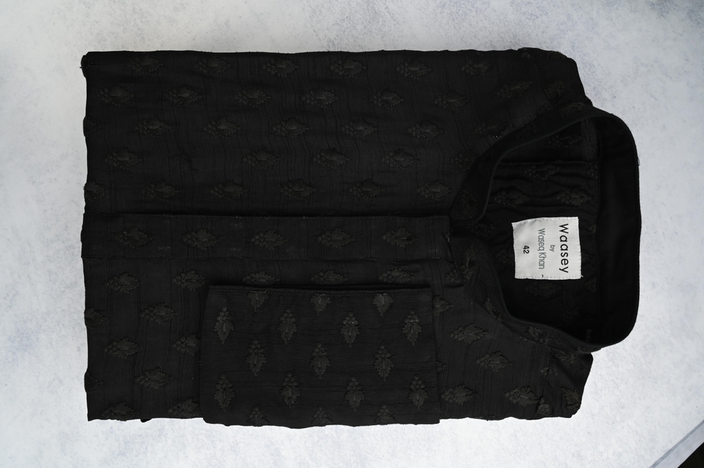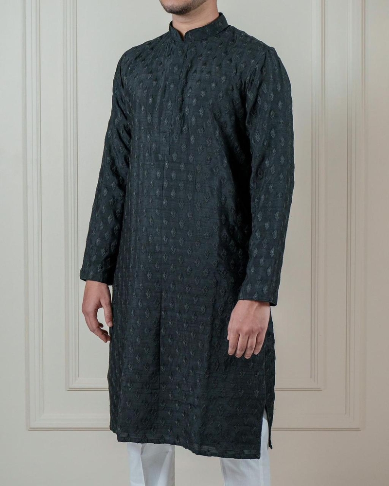 This panjabi is crafted from a rich black fabric with an intricate textured pattern throughout, giving it a sophisticated and luxurious feel. The subtle texture adds depth and interest to the classic black silhouette, making it an ideal choice for formal events or evening gatherings. The monochrome design maintains a sleek and modern look, perfect for those who appreciate understated elegance with a touch of uniqueness. This panjabi is both stylish and versatile, making it a must-have for any discerning wardrobe.